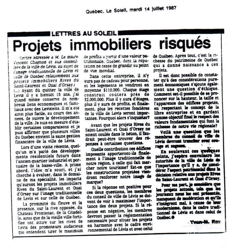 Il y a 25 ans, concernant les rives du Vieux-Lévis, un appel à la modération…. qui sera radicalement ignoré.