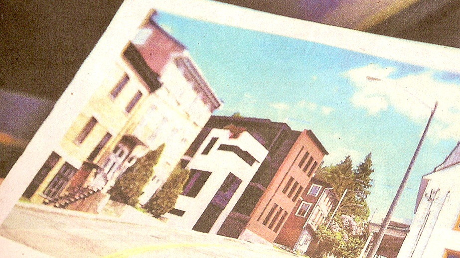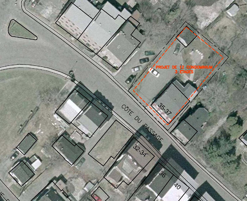 Voici une représentation aérienne de la côte du Passage avec les bâtiments existant actuellement. Observez le pointillé, il indique la dimension du projet proposé par M. Garant à la ville de Lévis. Ce tracé occupe tout l’espace de terrain, ne respectant que les marges de 1.5 mètreen périphérie. La hauteur autorisée est de trois étages.