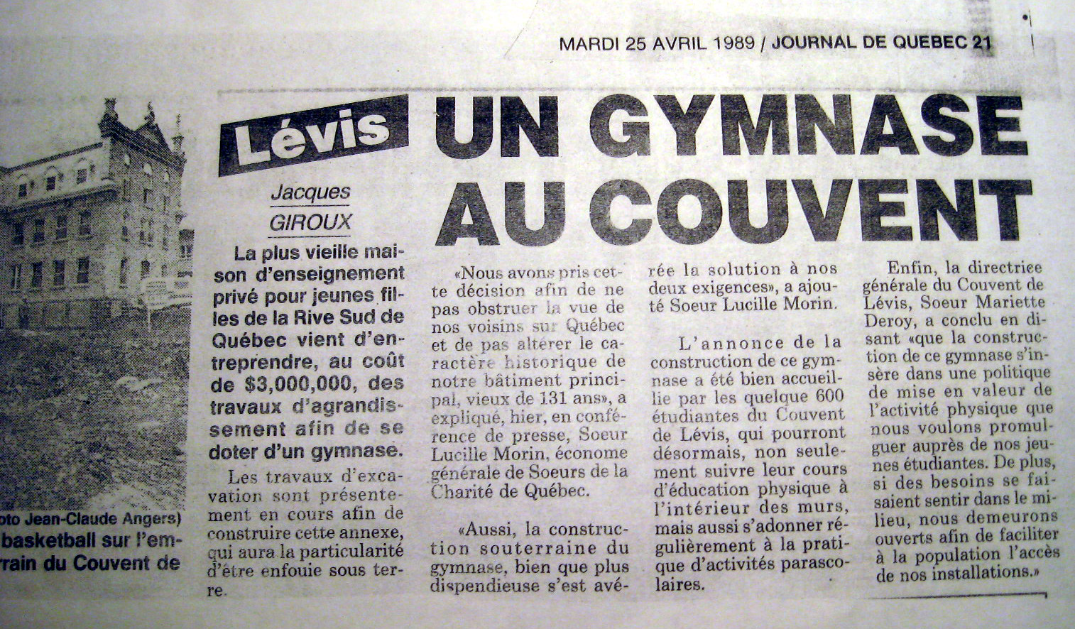 Le journaliste Jacques Giroux dans le Journal de Québec (25.04.1989) rapportait, il y aura bientôt 25 ans, la progression des travaux de construction du gymnase du Couvent de Lévis (école Marcelle Mallet) :