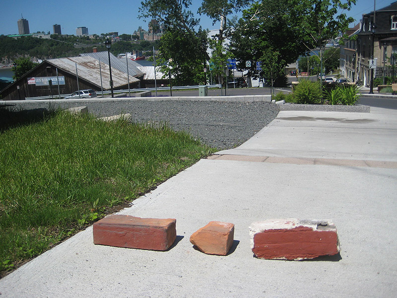 ‘‘Quelques briques de la vieille maison Davies-Ramsay, libérées brusquement du mortier ou elles étaient enserrées depuis 1830, regardent une dernière fois le vieux Château rouge de Québec qu’elles observaient depuis le début de sa construction (1894)’’.
