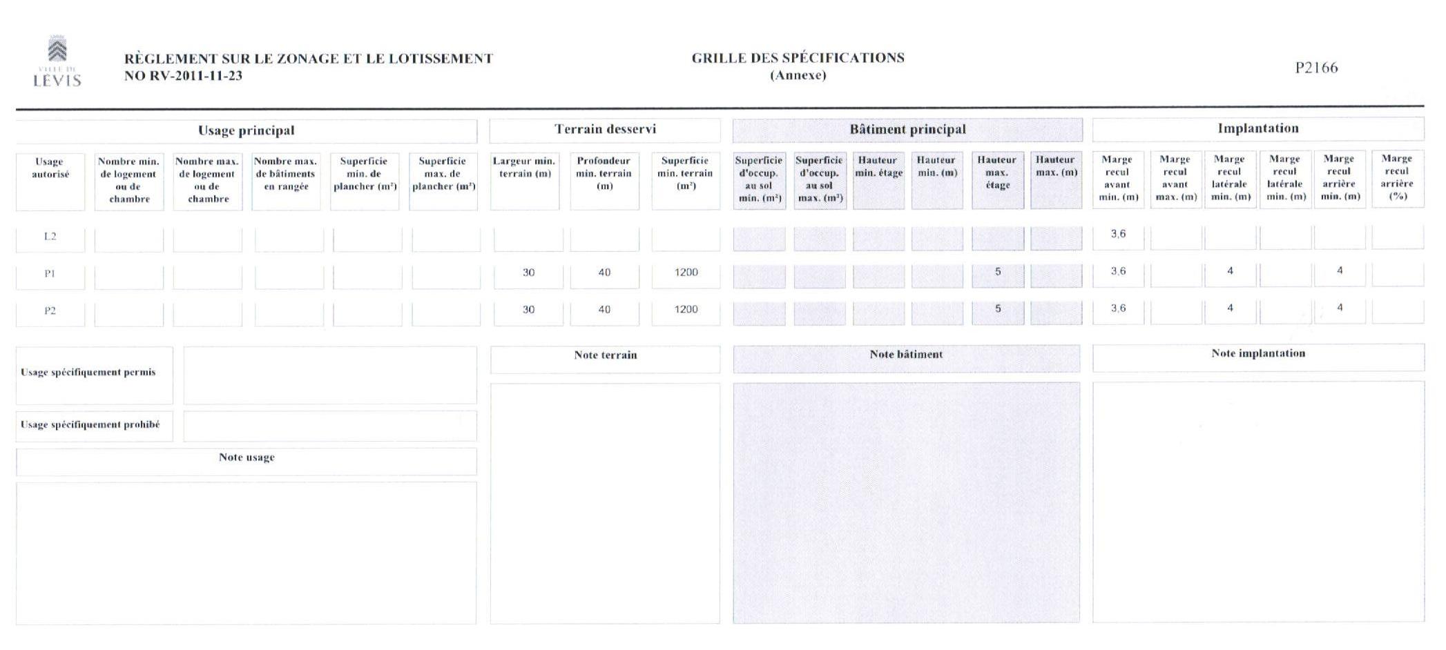 Inscrits à la grille de spécification de Règlement, les usages principaux sont au nombre de trois, soit L2, P1 et P2 — Cliquer sur la grille pour agrandir