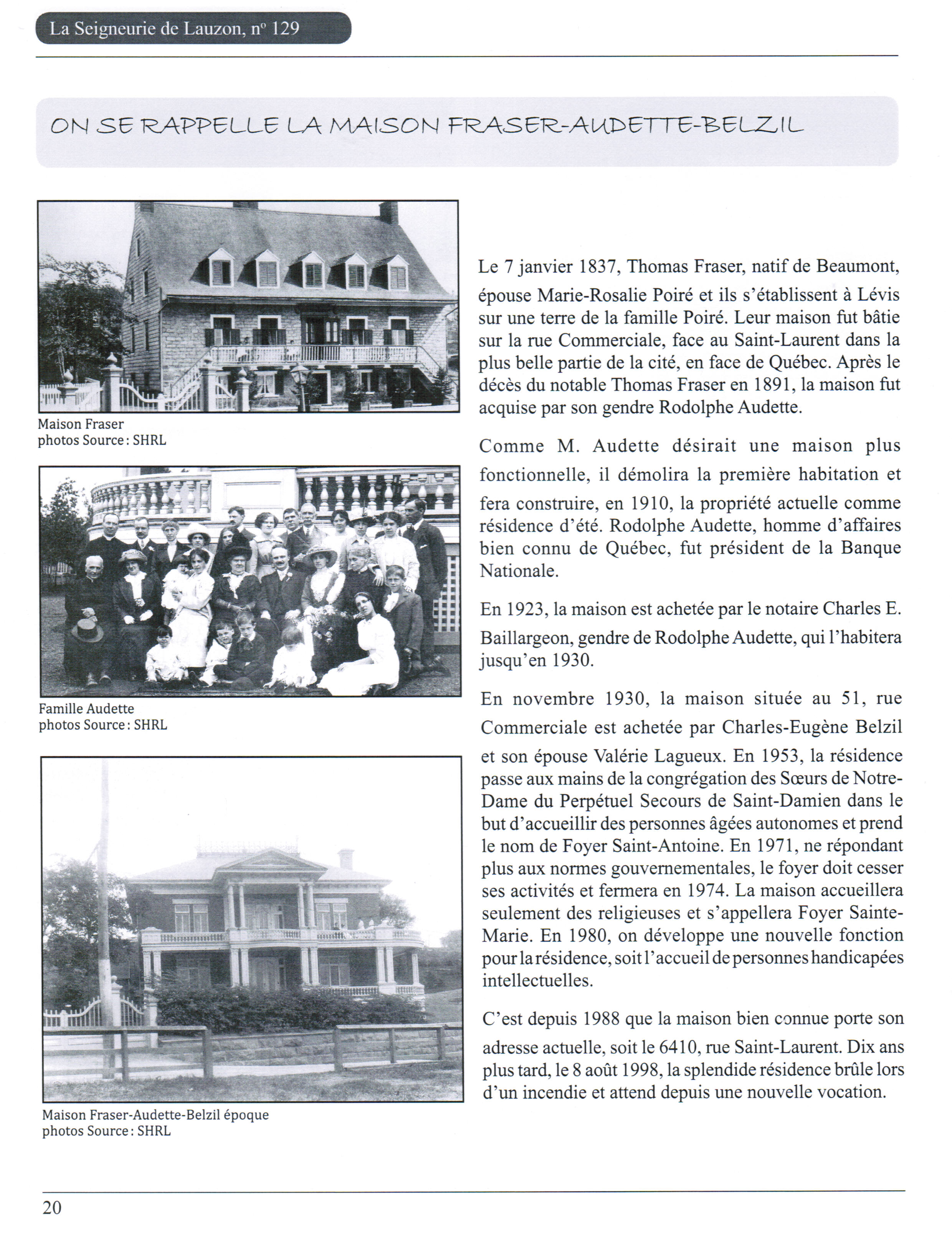 C’était à peine il y a moins d’un an, à l’été 2013, la Société d’histoire régionale de Lévis, dans l’édition de sa revue No 129, a rappelé l’importance historique de la propriété Fraser-Audette-Belzil.