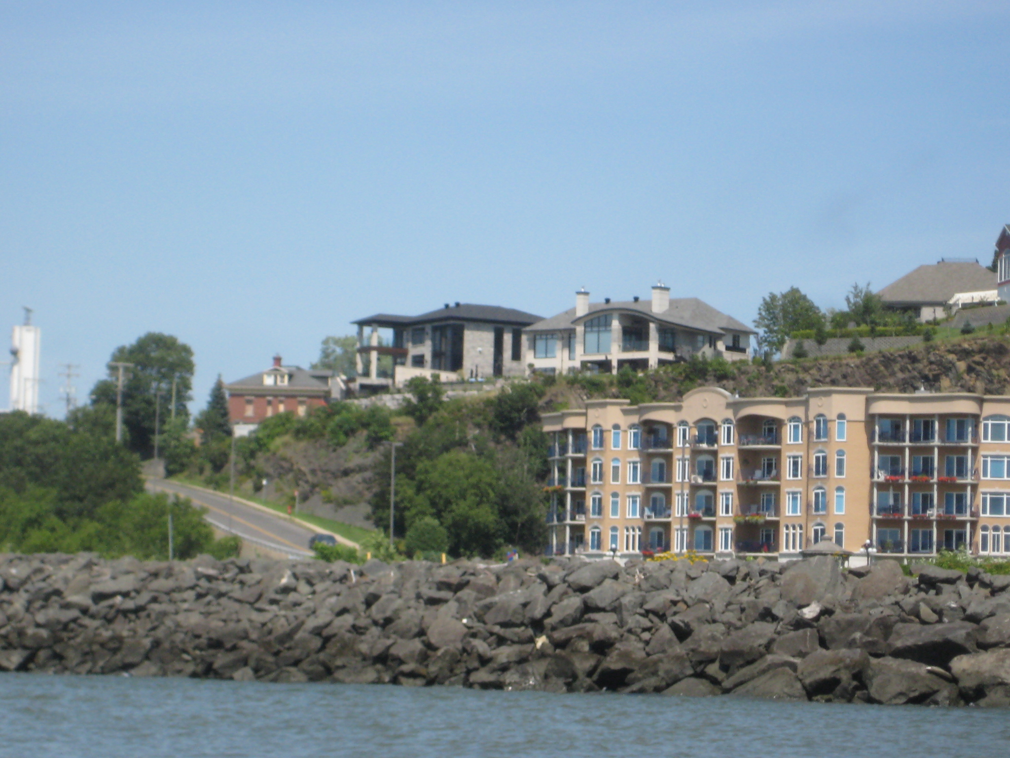 Les photos qui suivent montrent Homestead et les constructions récentes à l’est de la maison Homestead. La volonté de la ville de Lévis a-t-elle été de rechercher la protection et la mise en valeur d’un site historique national lorsque qu’un promoteur s’est présenté pour faire approuver le plan d’implantation et d’intégration architecturale qui cristallisait son projet ? Est-ce que la ville n’a tout simplement pas balancé les objectifs et les critères du Règlement sur les PIIA pour satisfaire l’appétit des promoteurs et des prêteurs immobiliers ? La ville a-t-elle considéré l’alignement des toits, la différence de volumétrie entre les constructions projetées et la maison Homestead? La ville a-t-elle porté une attention à la partie de la falaise qui va en diminuant vers l’est dans cette partie du secteur de la Traverse?